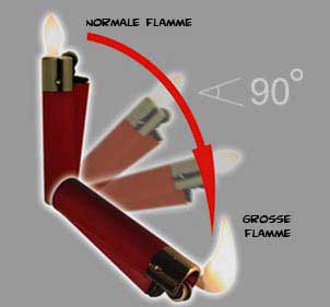 Die Flamme vergrößert sich, sobald man das Feuerzeug nach unten neigt.